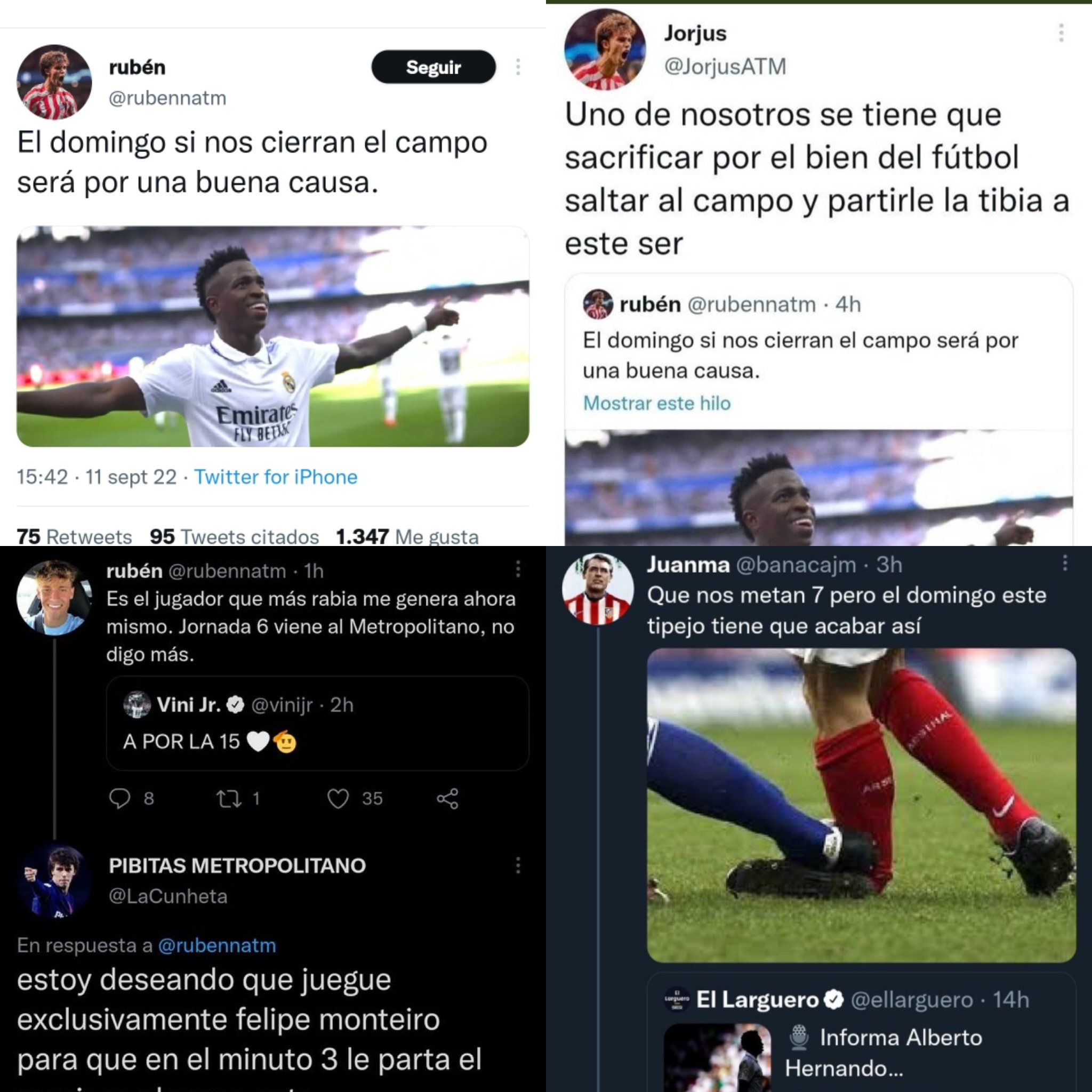 Ahora es una discusión etc etc si el domingo en mitad de un partido salta al campo un descerebrado y le mete un puñetazo como poco a vinicius ya nos lamentaremos ya condenaremos el acto y se les llenará la boca diciendo ese es un energúmeno no es aficionado del atlético ésa gente pone como excusa ser aficionado para hacer eso y bla bla bla.