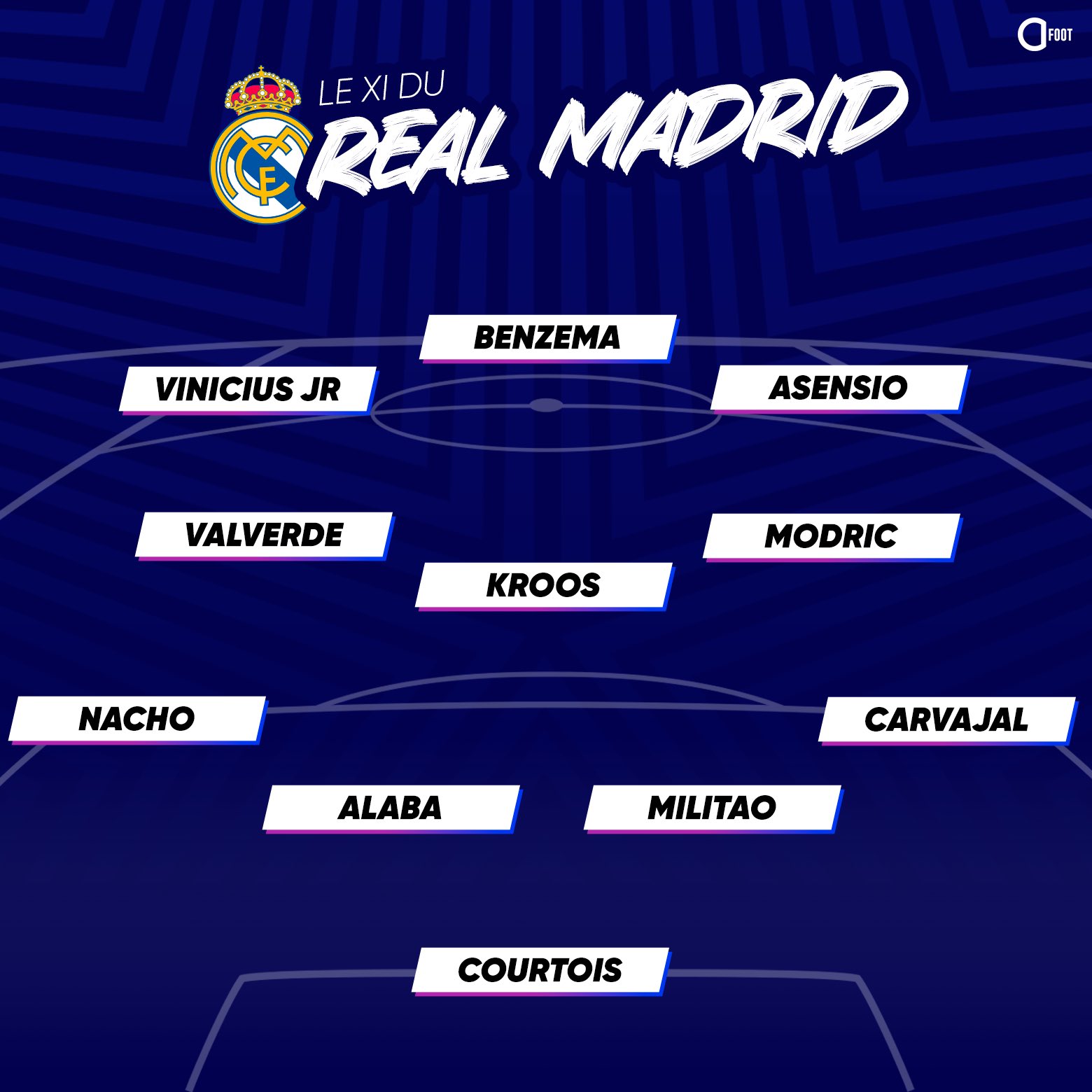 Courtois; Lucas, Militão, Alaba, Nacho; Valverde, Kroos, Camavinga; Modrić, Benzema, Vinícius
