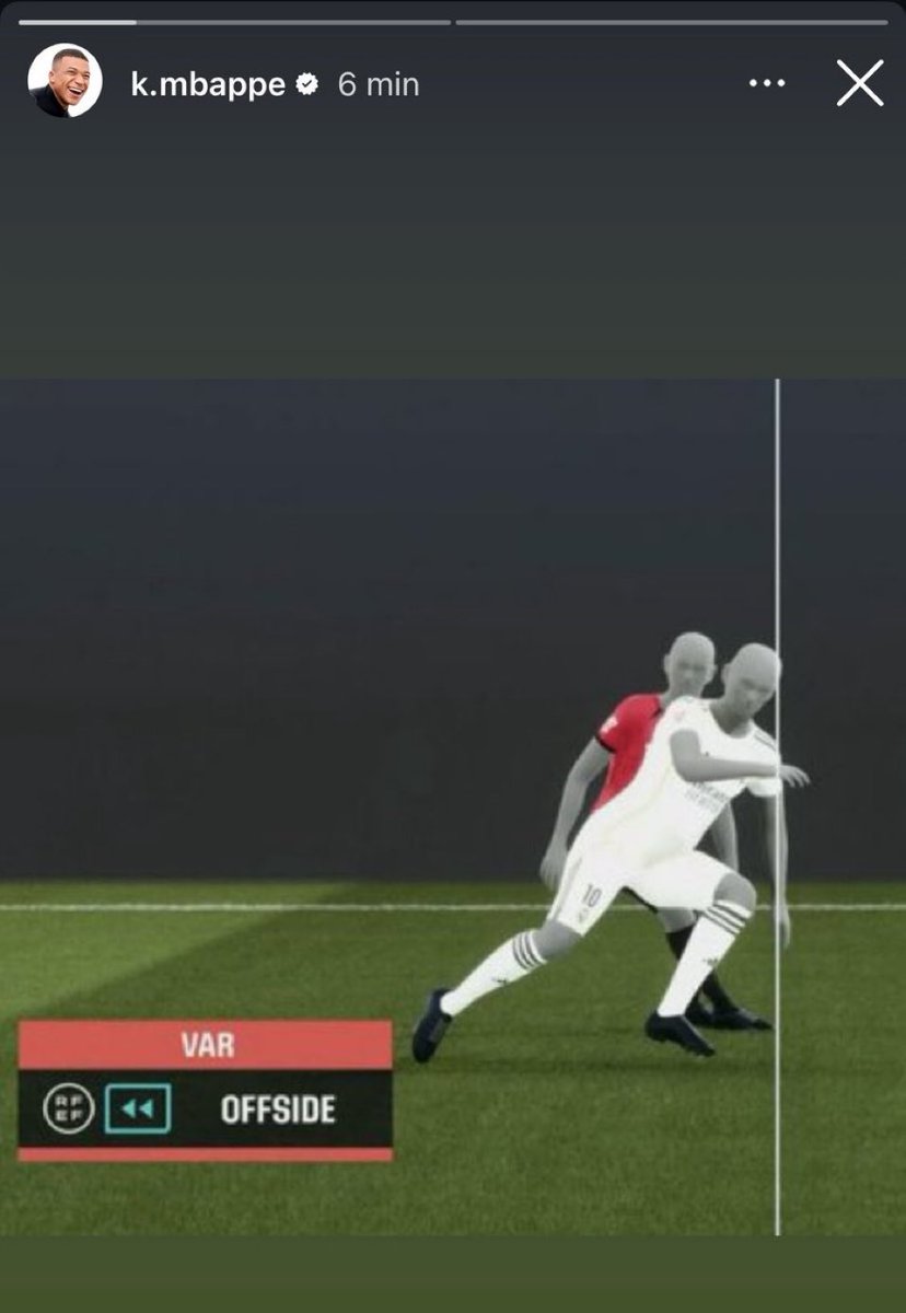 y el fuera de juego, ahi en el tweet de mbappé se ve, primero no se sabe sí cogen un frame anterior o posterior que eso es clave para determinar si está adelantado o no viendo que la jugada es justísima, pasa un rato desde la jugada polémica y la repetición, es más hay otro pase de trent a mbappé que el Galo dispara al lateral de la red y ahi si está claramente más adelantado y esa repetición sale antes que la otra, pero incluso tomando la imagen del VAR por buena me parece ridiculo y no hablo porque sea del madrid, hablo en GENERAL que esa jugada se pite como fuera de juego porque sea del Madrid intuye que la frente de mbappé está dos milímetros adelantado, es tan justa la jugada que esas jugadas no se tienen que pitar por el bien del espectáculo.