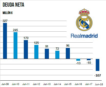 "No obstante, la entidad deportiva asegura que la deuda neta es en realidad positiva en 10 millones —caja, por tanto—, ya que a la bruta le resta el dinero que tiene en tesoreria (178 millones), además del saldo a cobrar por el traspaso de otros jugadores por 37 millones. Una posición que a día de hoy habrá mejorado, debido a 100 millones ingresados por el traspaso de Cristiano Ronaldo a la Juventus de Turín y teniendo en cuenta el pago de los fichajes de Vinícius y de Odriozola por unos 75 millones. Si el equipo blanco acometiese una de las incorporaciones mediáticas con las que se relaciona, como Hazard o Neymar, los números de la foto cambiarían sustancialmente."