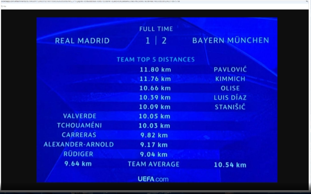 Pués si tú tienes la sensacion de que el madrid no se ha esforzado no ha corrido no ha disputado y no ha tenido intensidad porque sobre los datos hemos corrido 800 metros menos pués eres libre, y me dirás han corrido más teniendo más posesión… repito eres libre y me parece una lectura más del partido, pero hoy no es un partido para criticar al equipo, bueno si porque han perdido y se han cometido errores que además han costado 2 goles obvio, aunque delante no tenías a un equipo de segunda ref, tenías al bayern a este bayern que es una envidia ver como presionan, pero durante los más de 120 años de historia pones el partido de hoy en unos cuartos de champions con un 1-2 y es un resultado válido en el sentido de 2 gigantes de Europa que se enfrentan y hay un resultado ajustado y un partido disputado.