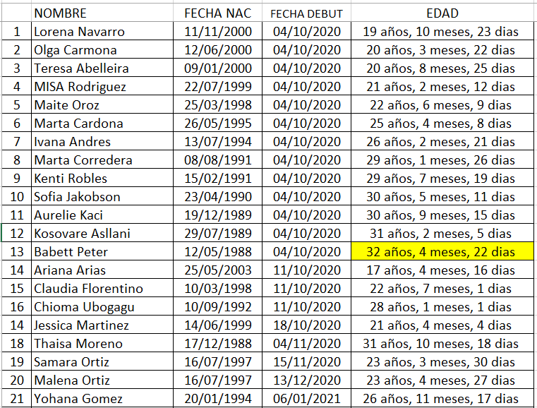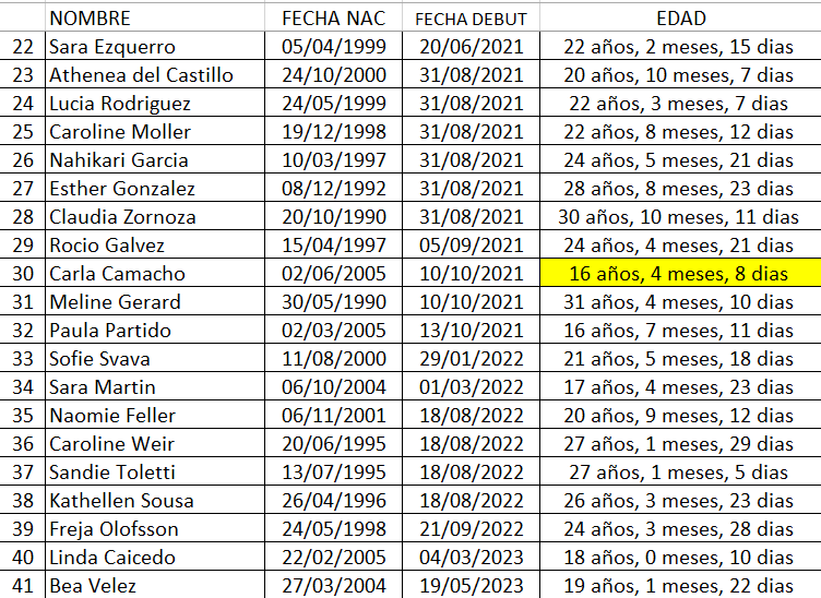 41 jugadoras han vestido nuestra gloriosa camiseta, siendo Carla Camacho la mas joven en debutar y Babett Peter la mas veterana