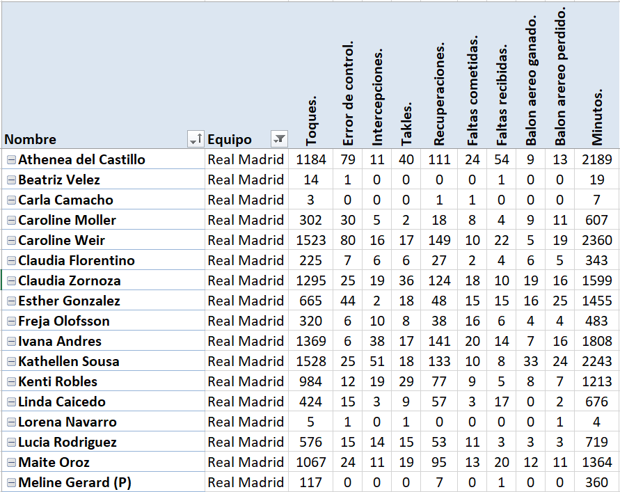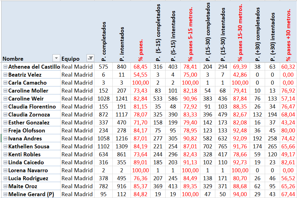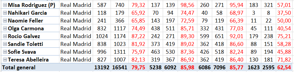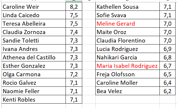 He calculado la media de nuestras jugadoras en Liga y asi quedaria la clasificacion, de mejor a peor