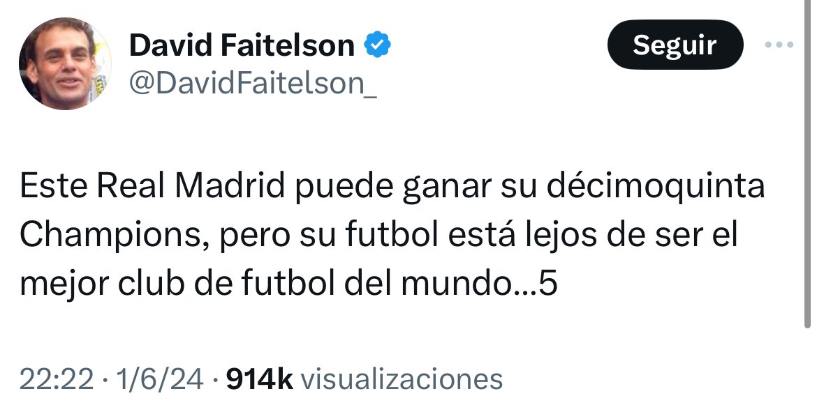 No vi tv esta noche, tuve que ponerme a trabajar para terminar todo lo que no hice por estar en el mitote del partido y viendo el partido, son 10:30 y acabo de terminar hace 15 min 🤡, pero le pregunté a mi padre de ello y dice que nada, pero es que él tampoco es vara de medir en eso porque dice que yo tengo la piel muy fina y que quiero montar un pollonon por una frase random que dicen 🤡😅, pero siendo espn no dudes que se la hayan pasado hablando del error del árbitro del último minuto (la que no dejó seguir), o de suerte, porque el Real Madrid nunca hace nada bien, siempre es demerito de los demás.@bidondo Pongo esto aquí y seguiré buscando. @Cesar04, te encargo los de ESPN, que son de tu tierra. ;-)